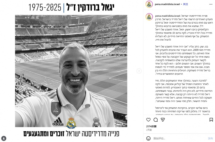 11月02日讯 据以色列皇马球迷会阐发,在上周末的西班牙国度德比中,又名以色列的皇马球迷伊加尔-布罗德金因腹黑骤停磨折逝世,享年50岁。