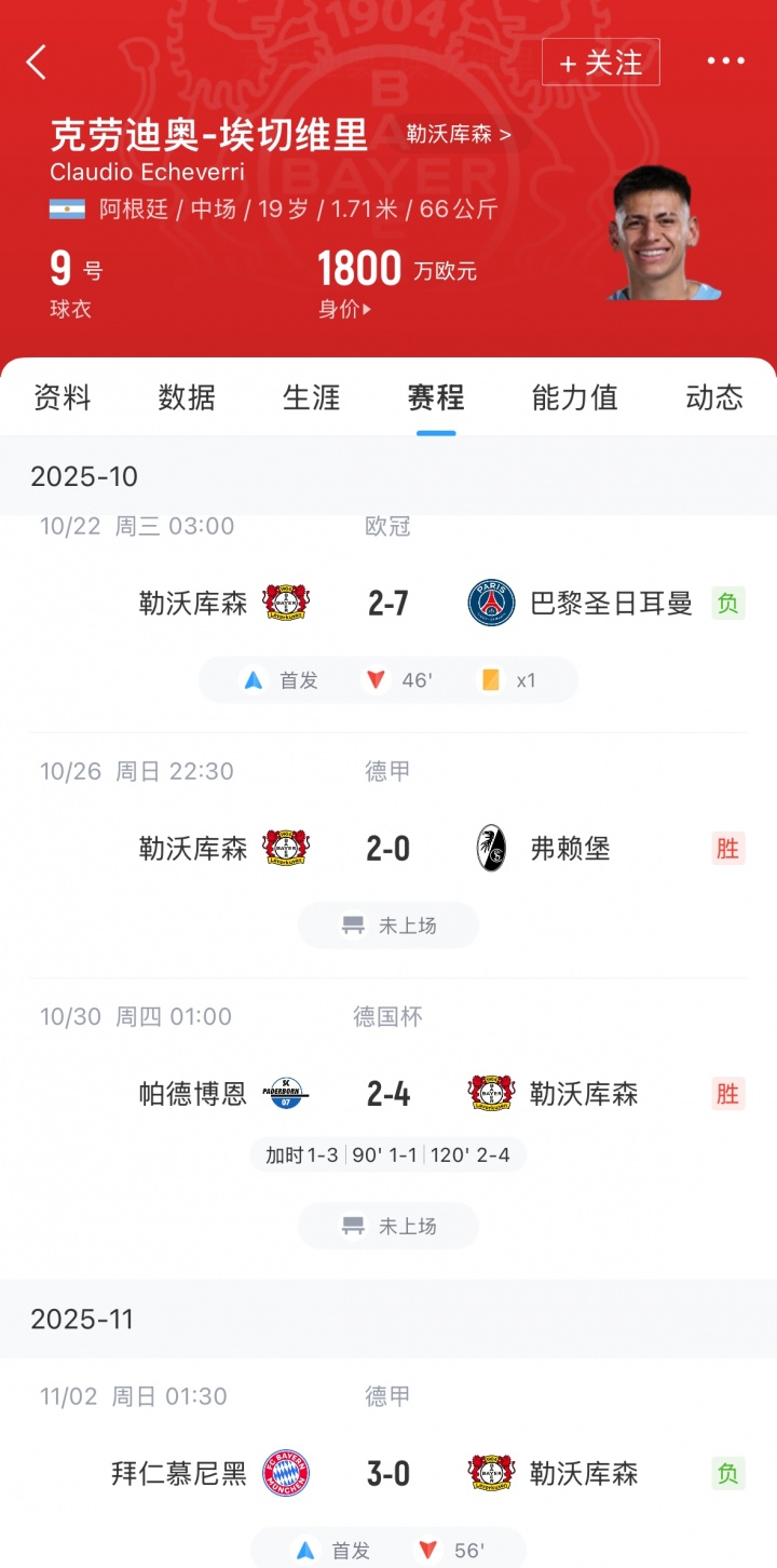 埃切维里从曼城租赁至勒沃库森后,当今出战7场比赛,出场本领183分钟送出1次助攻。濒临巴黎和拜仁埃切维里均首发,而德甲濒临弗赖堡和德国杯对阵帕德博恩,埃切维里齐没能取得出场契机。