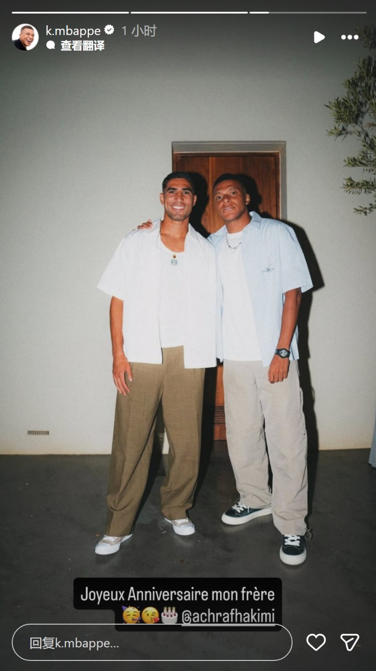 巴黎边卫阿什拉夫迎来27岁寿辰,姆巴佩社媒晒出与阿什拉夫的合照,配文:“寿辰鼎沸,我的兄弟。”