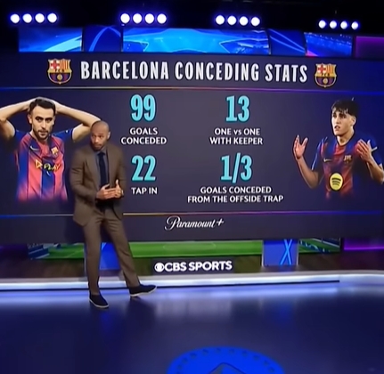 11月27日讯 亨利解释欧冠比赛时,分析了弗里克捏教巴萨后的丢球数据。