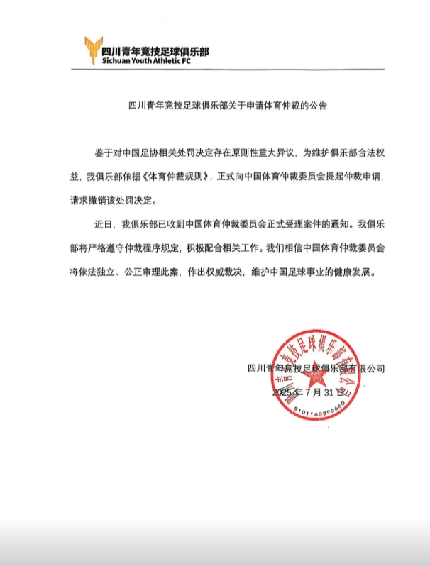四川后生竞技足球俱乐部对于请求体育仲裁的公告