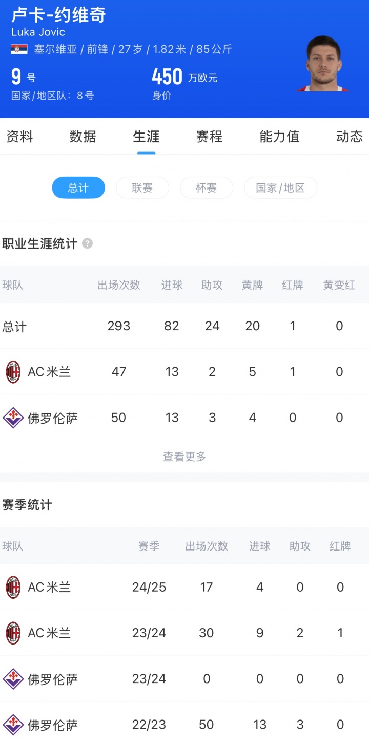 约维奇本年27岁,他于2023年9月加盟AC米兰,并在本年7月成为开脱球员。约维奇此前曾为法兰克福遵守,并在2019年7月以高达6300万欧元的身价转会皇马,但只是过了两年就被租回法兰克福,而况于2022年开脱转会加盟佛罗伦萨。干事活命当今出场293次,打进82球助攻24次。