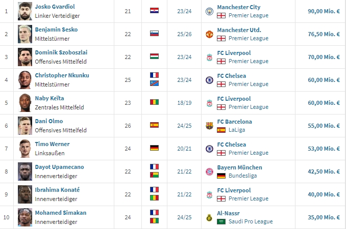 据德转统计,塞斯科的转会将成为莱比锡红牛队史出售球员金额的第二位,其中前五名球员均赶赴英超,前10中英超买东谈主也占据7席。