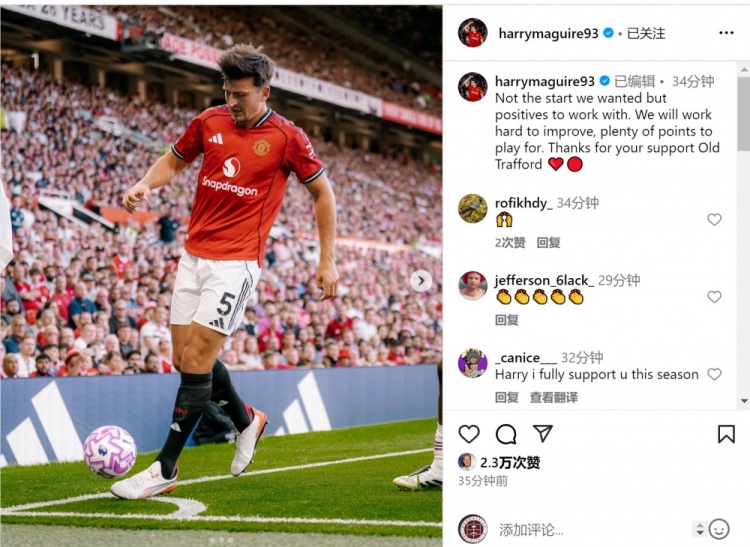 马奎尔社媒晒出比赛相片,并写谈:“这不是咱们念念要的开局,但也有积极的要素不错吸收,咱们会辛勤纠正,还有无数的积分不错争取。感谢人人在老特拉福德的搭救。”
