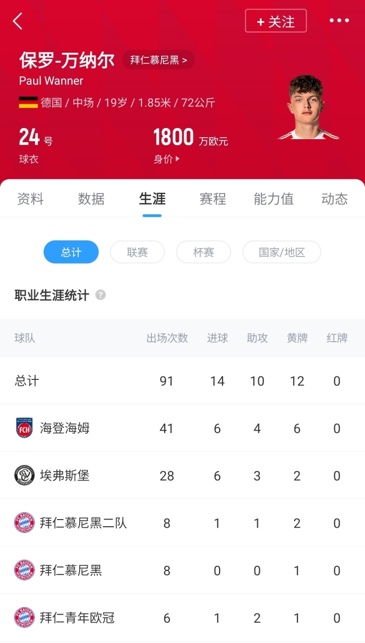 万纳尔,现年19岁,德国中场,上赛季被拜仁外租至海登海姆,出战41场比赛,孝敬6球4助,现在德回身价1800万欧。