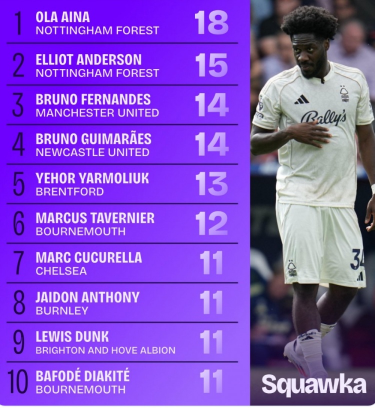8月28日讯 Squawka统计了英超前两轮比赛球员夺得球权的次数,并排出榜单,诺丁汉丛林后卫埃纳18次居首,其中10次来自对阵水晶宫的比赛。