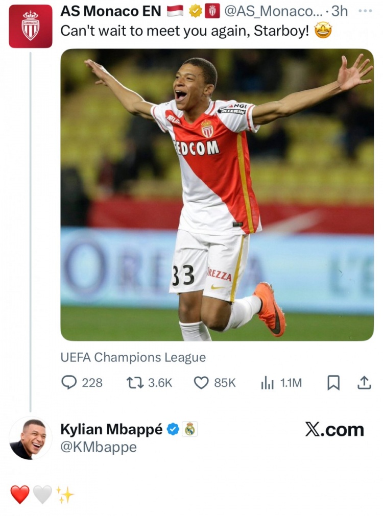 摩纳哥社媒晒姆巴佩青涩照:迫不足待思见你,后者恢复:❤️🤍