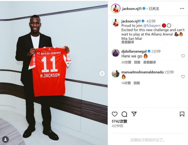 杰克逊晒动手拿拜仁11号球衣的相片,并写说念:“很自重能加盟拜仁,对这个新挑战感到应许,迫不足待念念要在安联球场踢球了!Mia San Mia!!”