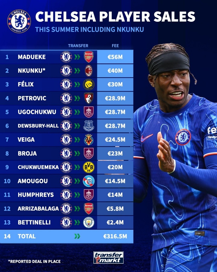 顶级制服组!切尔西超4000万卖恩昆库,今夏卖13东说念主收入超3.16亿欧