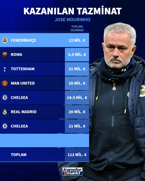 08月30日讯 费内巴切昨日官宣穆里尼奥下课,这是他合手教活命第7次被衔命。有报谈称穆里尼奥这次将获取1200万欧的解约抵偿,德转为此统计了穆里尼奥合手教活命的累计衔命抵偿金。