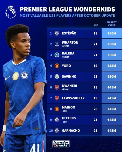 英超U21球员身价榜: