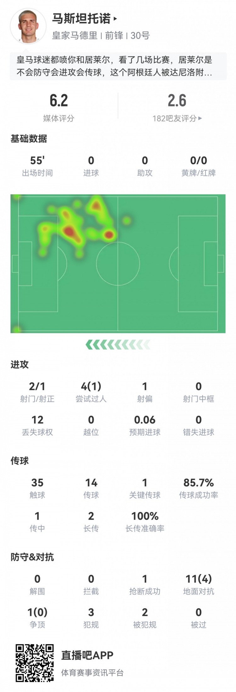 评分仅6.2!马斯坦托诺数据:2射1正,1次枢纽传球,12次丢失球权