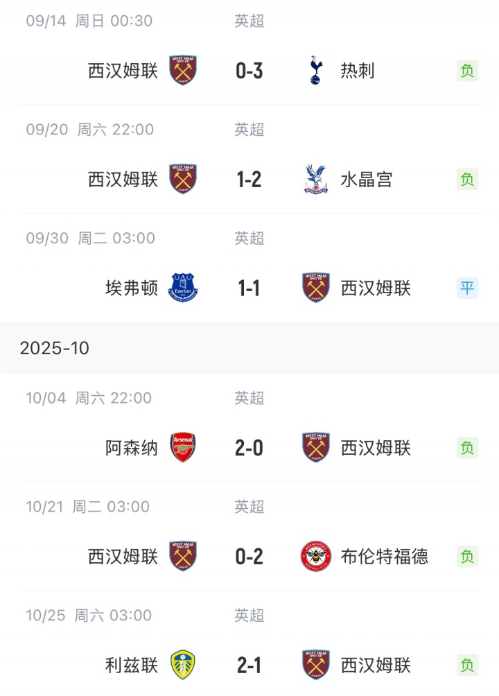 西汉姆1胜1平7负,先赛暂排倒数第二,联赛已三连败、六场不堪。