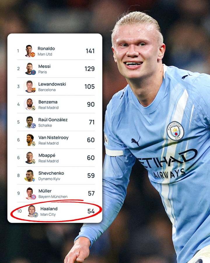 25岁的哈兰德已置身欧冠历史弓手榜前10