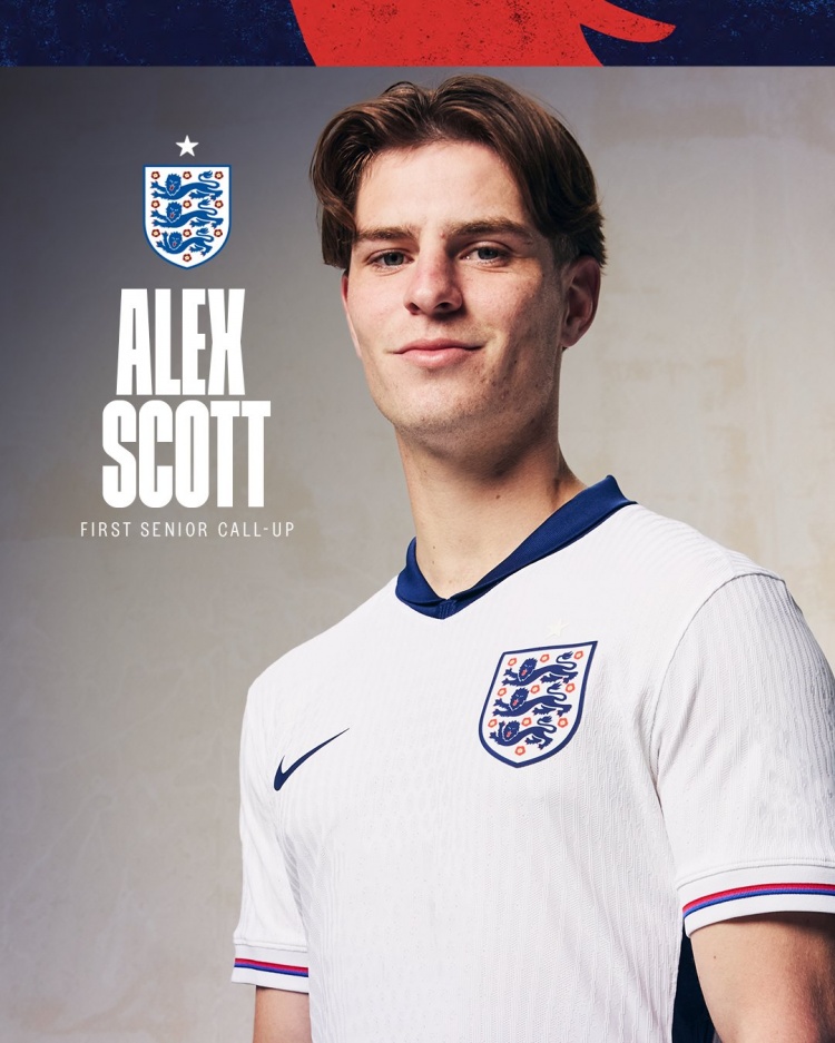 英格兰队公布新一期名单,伯恩茅斯22岁中场斯科特初度入选,英格兰队官方社媒晒出斯科特的海报,对他暗示祝颂。