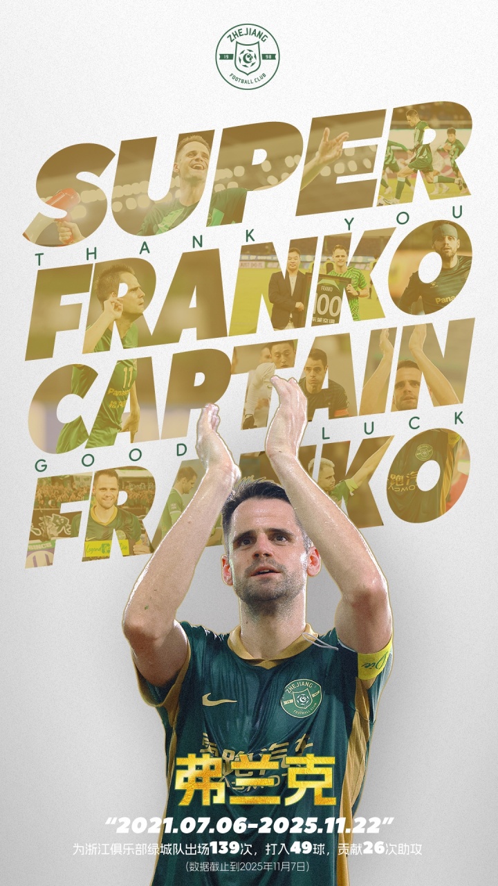 弗兰克在浙江俱乐部绿城队的时光行将终结,但他在浙里写下的故事,将成为浙江足球不朽的金钱。Super Franko,Captain Franko,谢谢你。