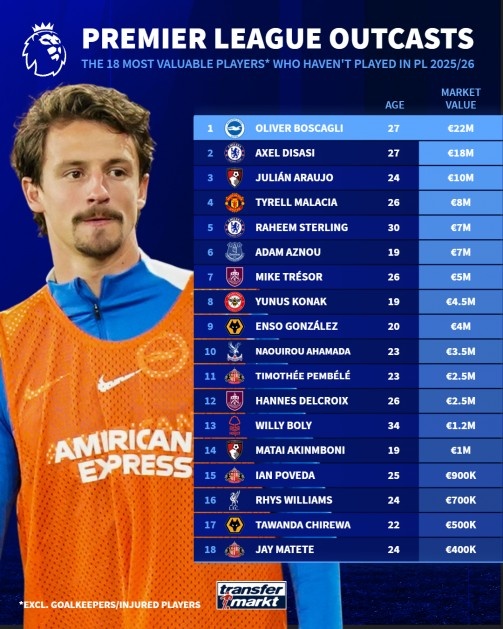 本赛季英超未出场球员身价榜:博斯卡利2000万欧居首,迪萨西第二