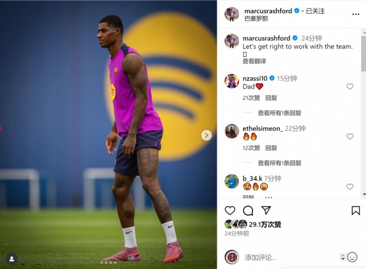 拉什福德从曼联租赁加盟巴萨,今天参加了巴萨的合练,他在交代媒体上晒出磨练像片,配文:“立即与球队沿途过问磨练。”